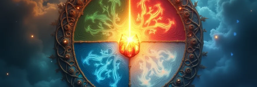 - La roue des éléments : Un symbole qui représente l’interdépendance des 4 éléments et leurs interactions. La roue des éléments est un symbole puissant qui représente l’interconnexion des forces de la nature.